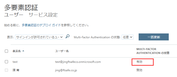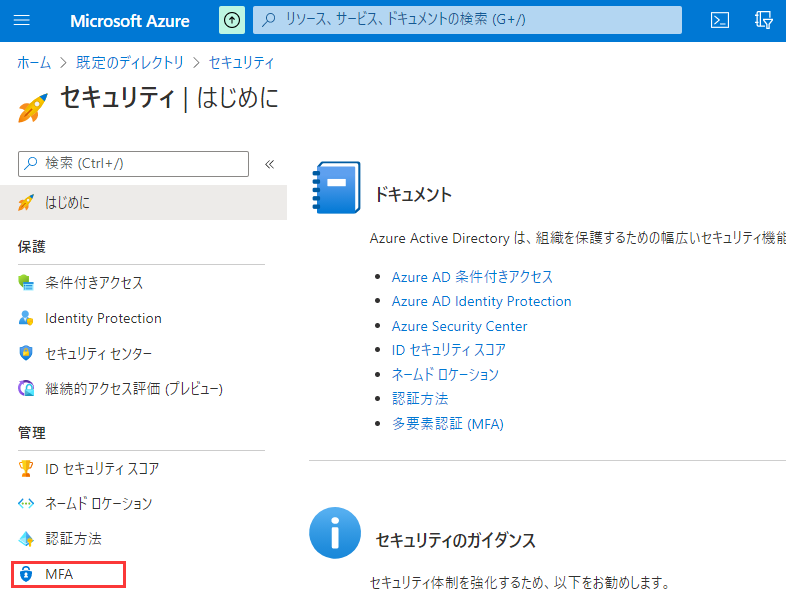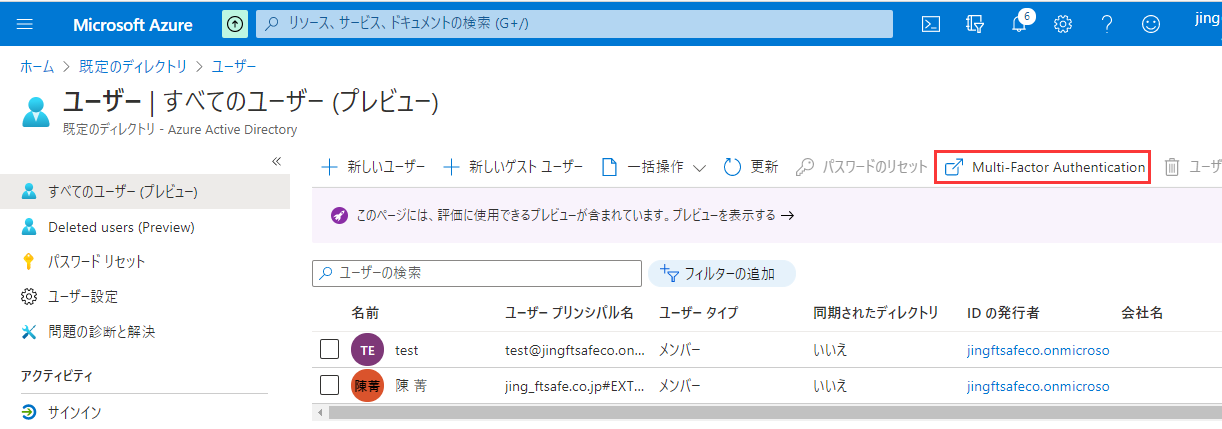1.[Azure Active Directory] ⇒[ユーザー]⇒[Multi-Factor Authentication]の順でクリックします。