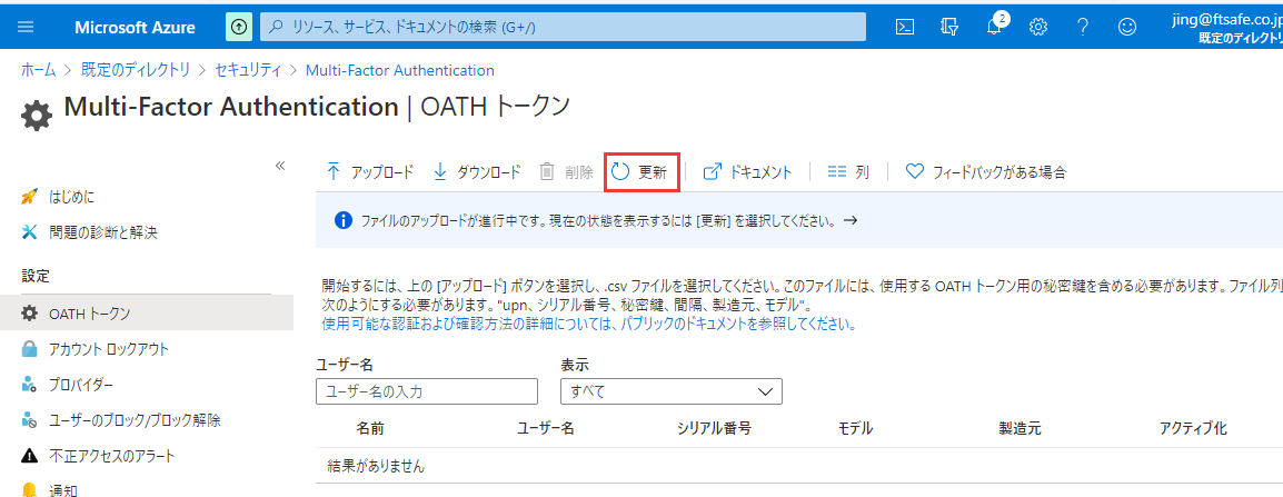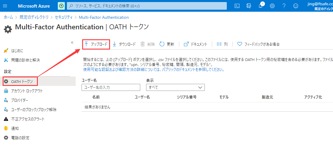 管理者は Azure portal にサインインして、 [Azure Active Directory] > [セキュリティ] > [MFA] > [OATH トークン] の順に移動し、作成した CSV ファイルをアップロードすることができます。