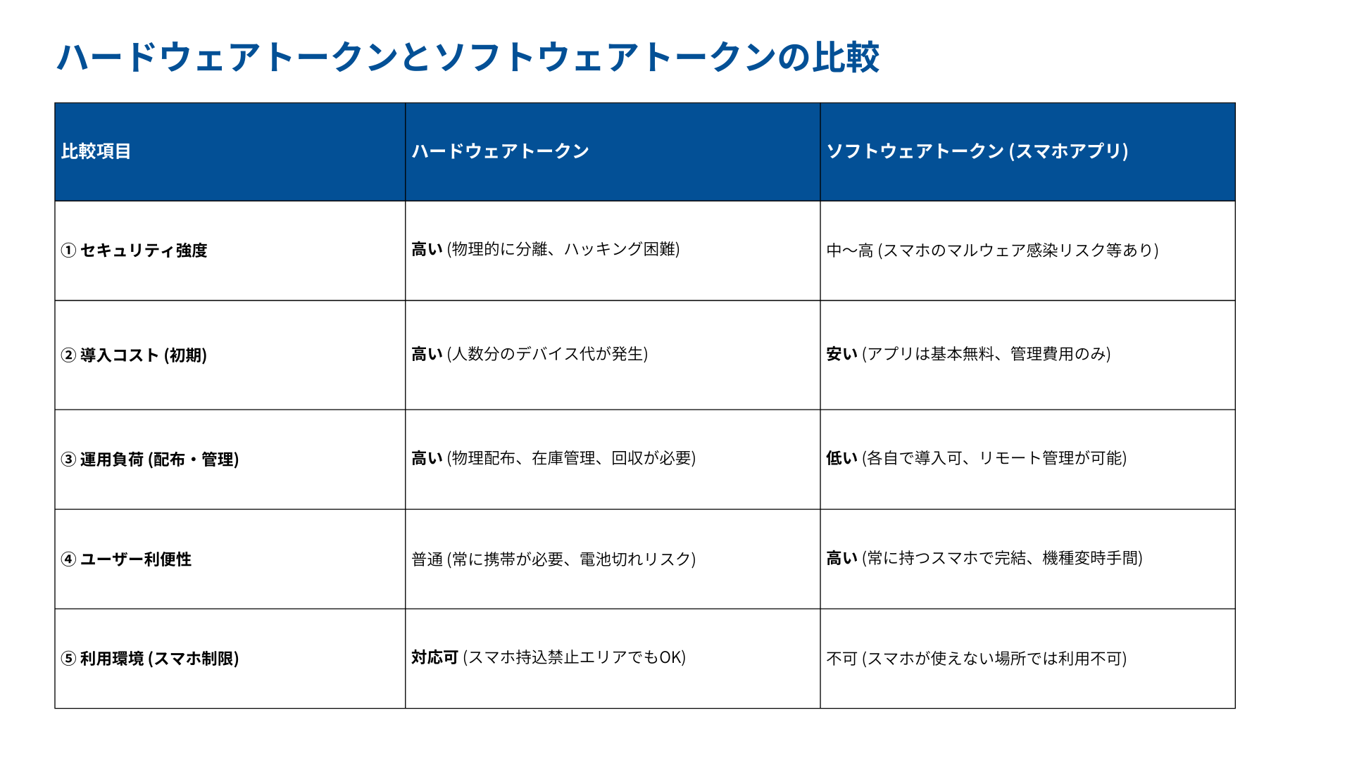 セキュリティの観点ではハードウェアトークンに軍配が上がります。