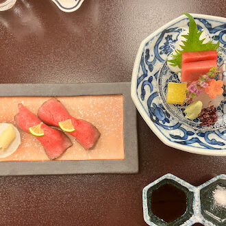 続いて提供されたのは、ローストビーフの握り寿司と色鮮やかなお造り。