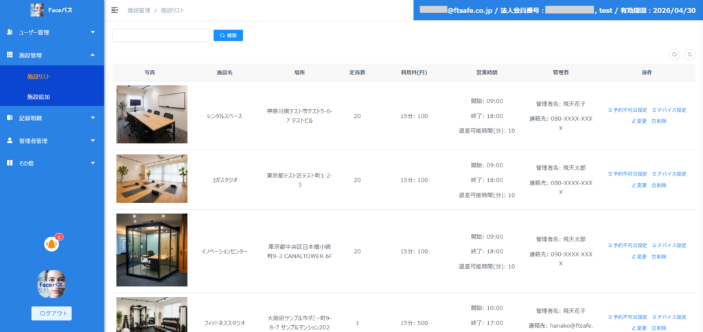 施設の設定(営業時間/定員数/利用料/予約不可日等)