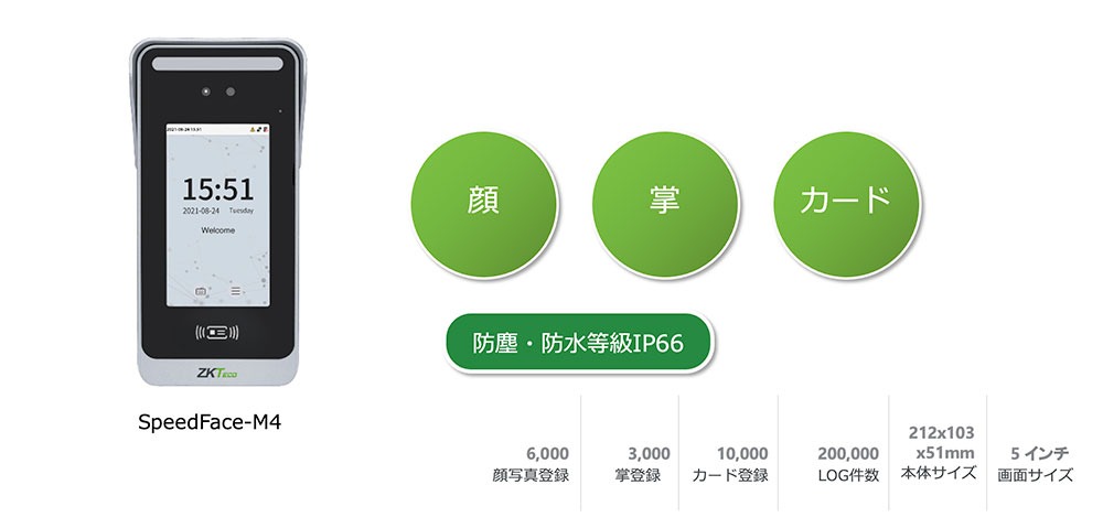 | 拡張性 | 電気錠と連携、専用ソフトAPI連携、AD連携、勤怠管理ソフト、Wifi対応(技術適合証明済み) | |||