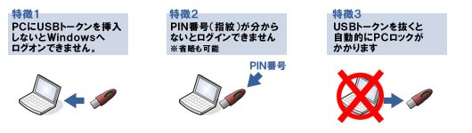 USBキー・トークンを物理的な「鍵」としてPCへ挿入するとWindowsOSが起動しログオンします。USBキー・トークンを挿入しないとPCをロックし、ログインできません。利用中にUSBキー・トークンを抜くと自動的にOSの稼動状態にPCロックがかかり不正使用を防止します。また、マルチユーザー環境もサポートしています。