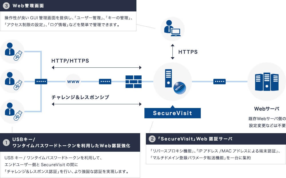 会員制サイトなどを安全に運用するには、何よりもWeb認証強化が欠かせません。「SecureVisit」は、USBキーまたはワンタイムパスワードトークンを活用した強固な二要素認証方式なので、IDとパスワードだけに頼る従来の認証方式より高度なセキュリティを実現できます。既存のWebサーバを改変する必要もないため、手軽に導入できるのも特長です。
