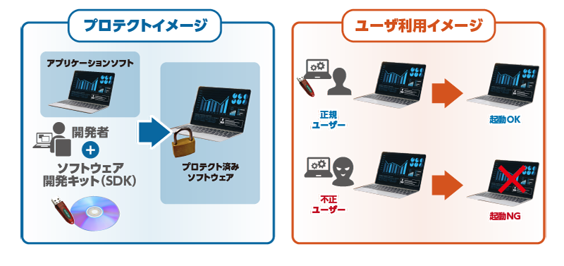 1. 不正利用を確実に防ぎ、収益を保護|「USBドングルをPCに接続している時だけ、ソフトウェアが起動する」。この物理的な制限により、購入ライセンス数を超えた不正利用を原理的に防ぎます。”使われている数 = 販売数”となり、貴社の売上向上に直接貢献します。
